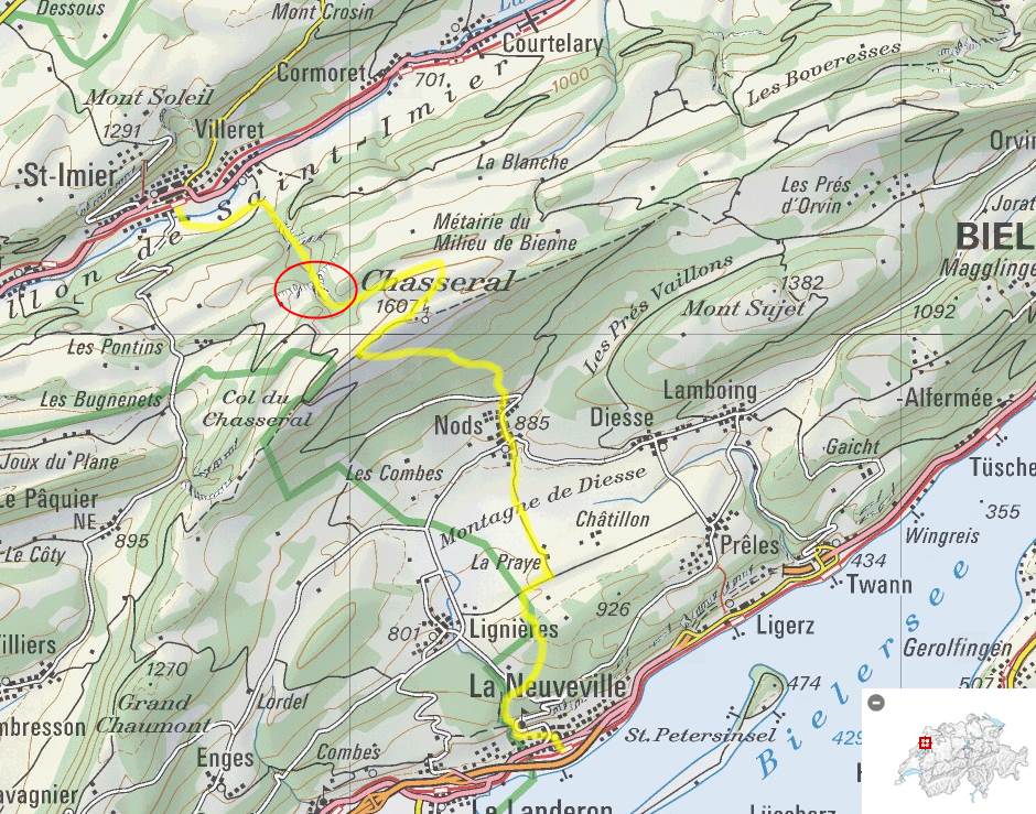 St.Imier (793m) - Combe Grède - Mét. des Plânes (1277m) - Mét. de Moral (1461m) 1.25h - Chasseral (1606m) 2.75h - Hôtel (1548m) - Nods (885m) - Bas de la Praye (801m) - Combe du Pilouvi - La Neuveville (433m) / T3 / 6.25h