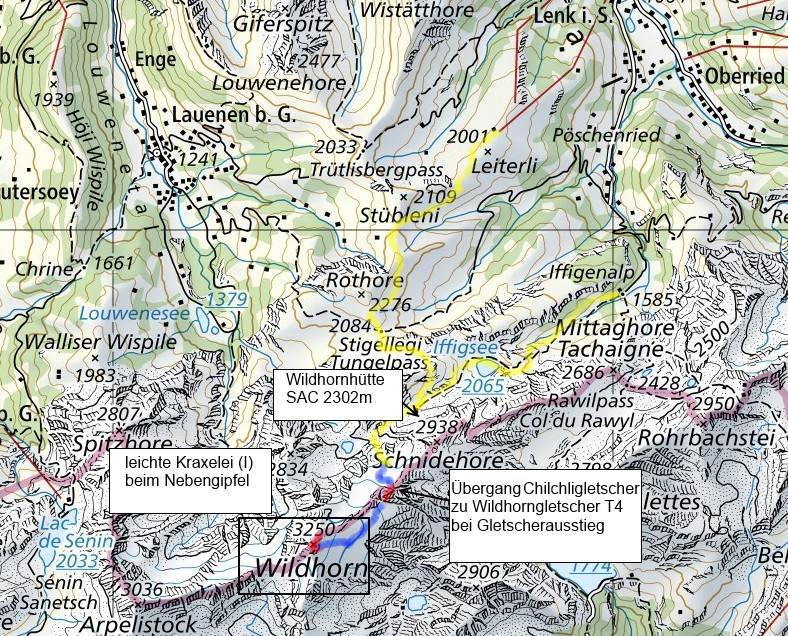 Wildhornhütte SAC - Chilchligletscher (2600m) 1h - Wildhorngletscher (2850m) - Wildhorn Gipfel mit Kreuz 3.5h (3240m) - Wildhorn (3250m) - Wildhornhütte SAC 6.25h - Iffigsee (2081m) - Iffigenalp (1585m) / L / T4 / 8.75h