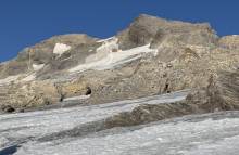 Morgens um ca. 5:45 Uhr brechen wir auf. In der zweiten Hälfte August ist zu dieser Zeit noch dunkel. Ueber eine Moräne führt der Pfad hoch zum Einstieg des aperen Chilchligletschers. Die Querung des Gletschers ist kurz. Der Aufstieg zur Bergflanke, welche zum Wildhorngletscher führt, ist relativ steil. Hier lohnt es sich, ohne Steigeisen über die felsige Passage zu gehen. Steinmannli weisen den Weg zum Einstieg des nächsten Gletschers. Der Wildhorn Gletscher ist zweigeteilt, so erreichen wir nach kurzer Zeit eine weitere steinige Passage, welche wir diesmal mit Steigeisen begehen. Bald sehen wir das Wildhorn vor uns. Nahe am Felsen gehen wir den Gletscher hoch. Das Gelände ist relativ steil. Auf dem Sattel angekommen besteigen wir zuerst den rechten Gipfel mit dem Kreuz. Nach kurzer Kraxelei stehen wir oben. Toll die Aussicht über die Walliser Alpen bis zum Mont Blanc. Bevor wir absteigen, gehen wir noch hoch zum eigentlichen Wildhorn Gipfel, unspektakulär abgeflacht aber ein paar Meter höher. Zurück bei der SAC Hütte führt der Wanderweg hinunter zum Iffigensee und von dort weitere 500 Höhenmeter abwärts zur Iffigenalp.